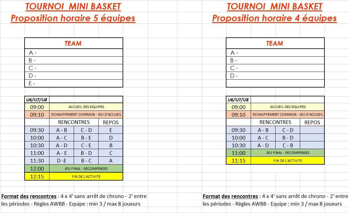 Tableaux pour l’organisation des tournois mini-basket.